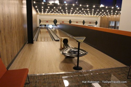 The 8 000 square foot facility which includes a lounge full service bar karaoke room and private vip room with two lanes is a retro inspired tribute to the classic bowling alleys.